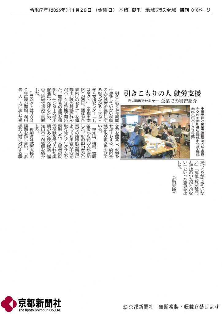 2025年11月28日発行の京新聞に当センターが舞鶴市で開催いたしました「Lコネクト活用セミナー@中丹」が掲載されました。